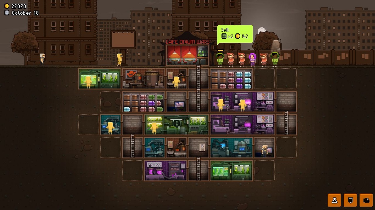 Графика выполнена в стиле пиксель арта, действия все наблюдаются как бы со стороны, в разрезе. Все иконки, истории, персонажи и отделения лаборатории выстроены из небольших пикселей. Такой оформление создано для того, чтобы передать атмосферу игры, мы видели такое в подобных проектах, но еще ни разу никто не додумывался сделать все это под землей. Что касается комнат, то их можно улучить и расширить ровно два раза, при наличии необходимых финансов, конечно. В игре есть 4 типа товара, постепенно все это будет расширяться, но пока что мы может производить 4 вида различных видов наркотиков.